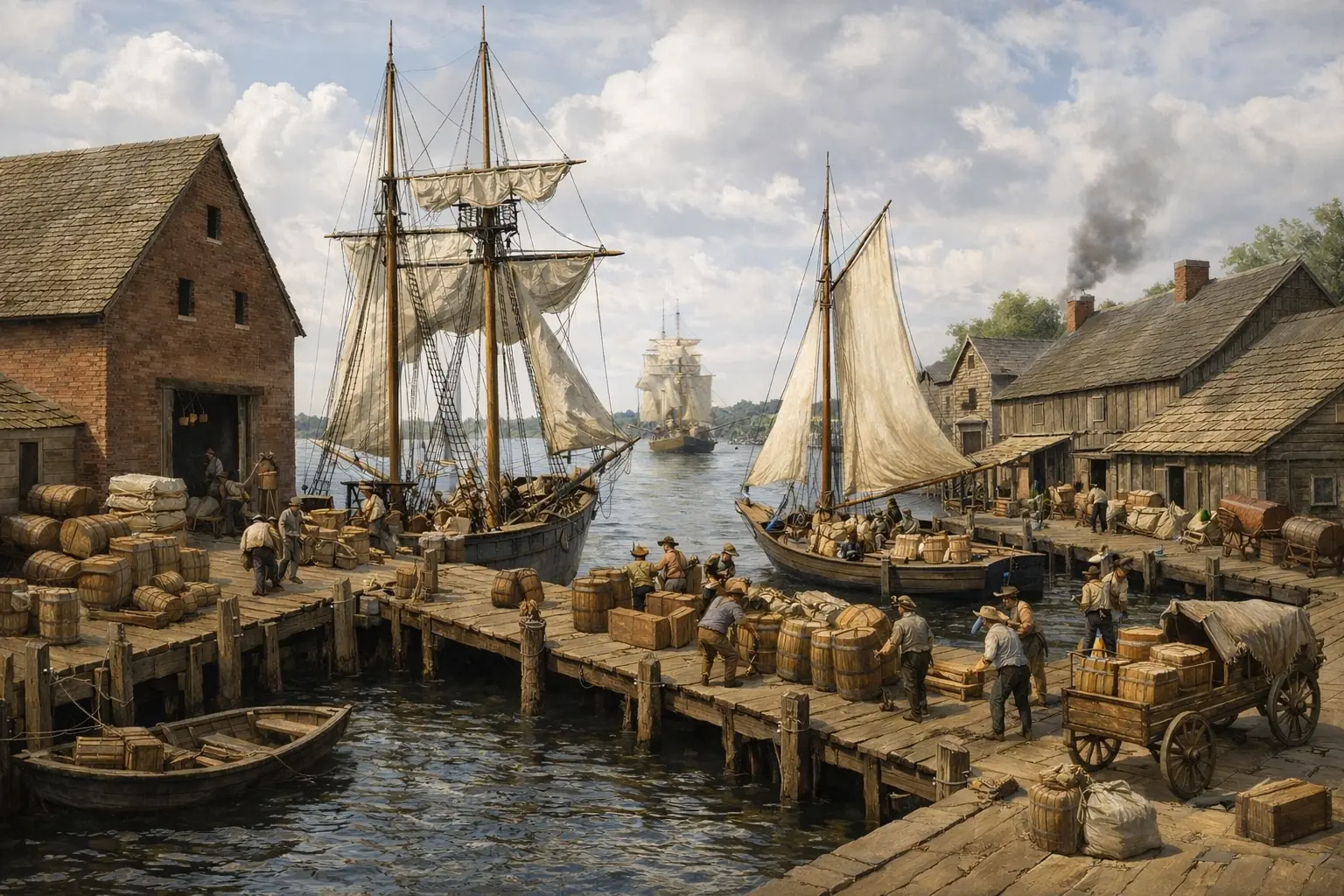 A fanciful view of the waterfront of Alexandria, Virginia, USA in 1780 as visualized by OpenAI's ChatGPT.