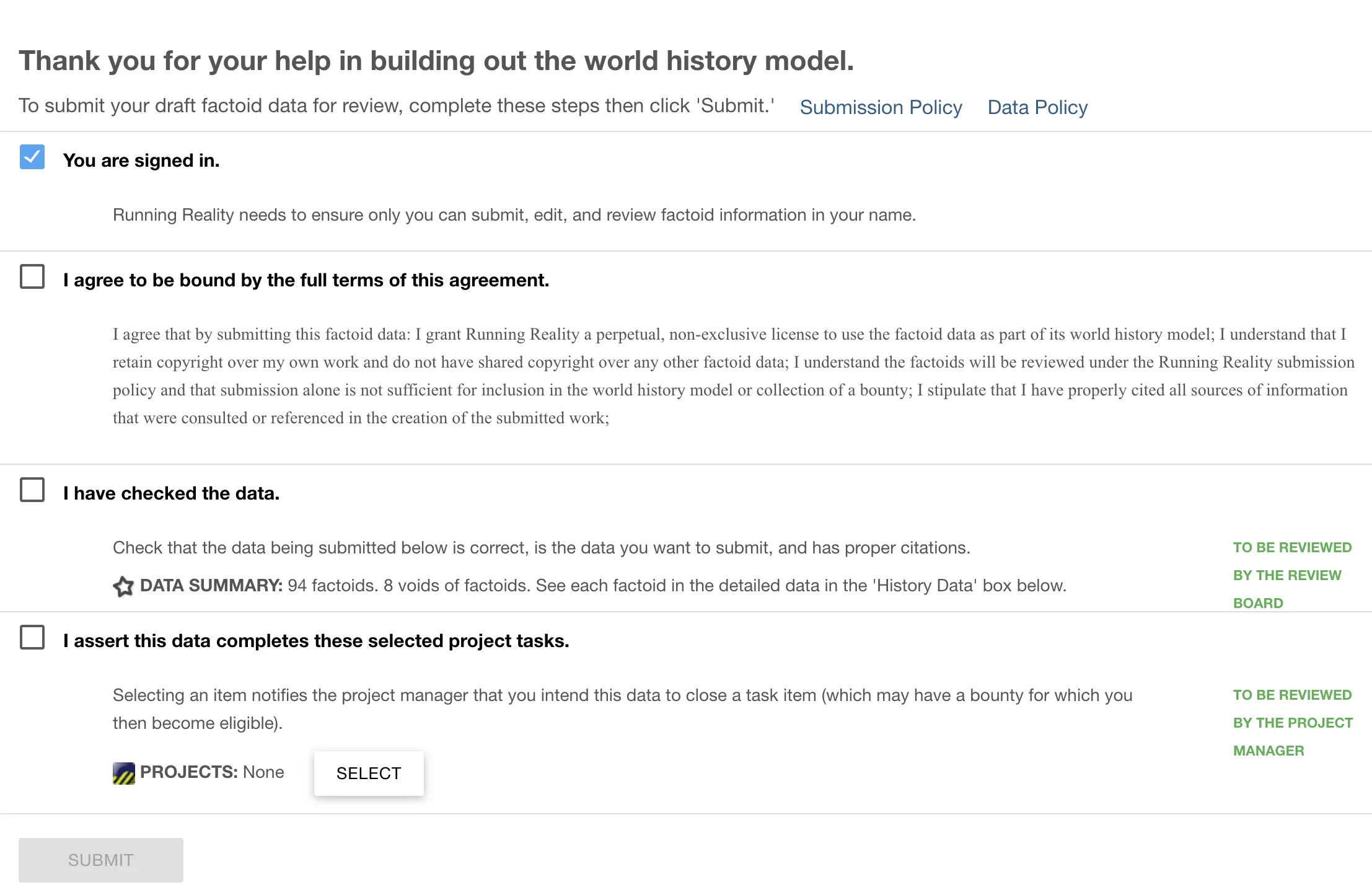 Running Reality maintains a submission policy to guide the review of factoid data that you submit. Data is reviewed before becoming public.