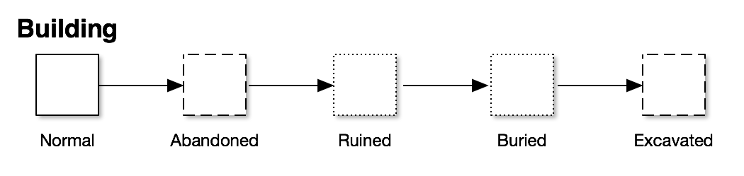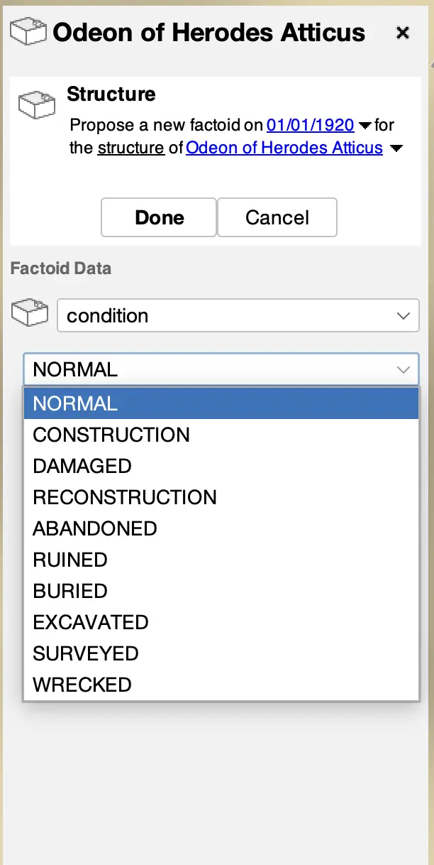 Running Reality tracks the structure's condition over time as well. Often, the condition is known but not the detailed structure. For instance, literary sources may indicate that a building was abandoned, but we do not have enough information to implement a new 2D footprint or a 3D model. Addition condition factoids give more historical context about a building and can help the history engine perform better inferences.